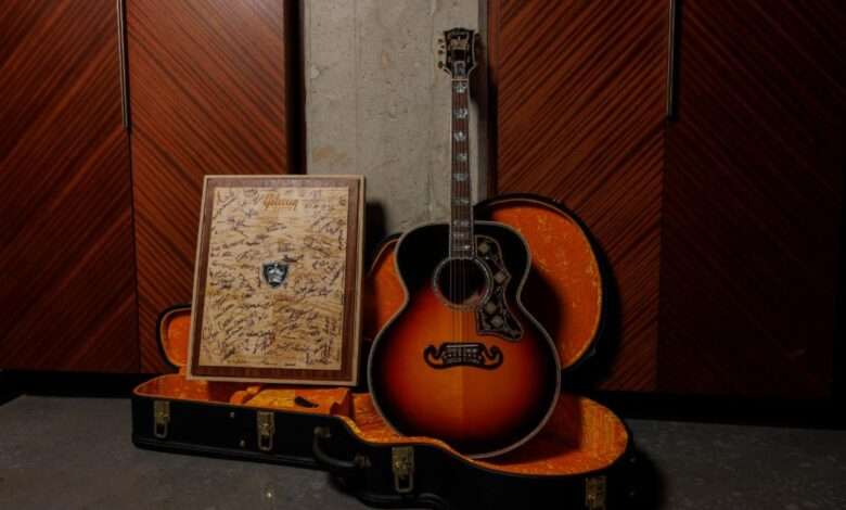 | A museum-worthy work of art, the Gibson Custom SJ-200™ Monarch #100 Brazilian Rosewood in Tri Burst is truly one-of-a-kind. First created in the mid-1990s, the SJ-200 Monarch has become the ultimate custom edition of Gibson’s world-famous Super Jumbo acoustic guitar. Crafted with an extraordinary level of handwork and attention to detail by Gibson’s elite team of artisans in Bozeman, Montana—whose combined experience exceeds 160 years—the SJ-200 Monarch is one of the most exclusive models produced by the Gibson Custom Shop. Each guitar is individually numbered in sequence, with its unique identifier located on the back of the headstock near the serial number. While every Monarch is a masterpiece, this one-of-one Monarch #100 guitar was created as a true standout—an exceptional instrument that sets a new benchmark in craftsmanship and artistry. This Gibson Custom SJ-200 Monarch #100 is available only via the Gibson Garage Nashville, call (615) 933-6000, and learn more about this one-of-one guitar on Gibson.com HERE. The SJ-200 Monarch #100 showcases an extraordinary selection of tonewoods and craftsmanship. Its sides are crafted from Brazilian rosewood, while the three-piece back combines Brazilian rosewood and AAAAA-grade flamed maple, highlighted by a hand-inlaid and engraved rosewood shield at the center, adorned with mother of pearl and abalone crown detailing. The top is made from premium AAA Sitka spruce, and the neck features a two-piece AAA maple construction with Indian rosewood stringers, a rounded profile, and a Brazilian rosewood fingerboard. Even the headstock veneer is fashioned from Brazilian rosewood. Revered for its rich low end and sparkling highs, Brazilian rosewood is one of the most sought-after tonewoods in the world. Every piece of wood used in the Monarch #100 was carefully selected from the Gibson Custom Wood Library in Bozeman, Montana. “The Monarch is derived from the SJ-200. In 1937 there was a cowboy singer named Ray Whitley who came to Gibson and said, ‘I want a big guitar, bigger than anything you are making,’ so they went in and found a body mold from one of the big archtops and built the SJ-200 acoustic guitar around it and it was the beginning of what became the flagship of our line. We’ve made many different configurations over the years, and in different woods. In 1994, we wanted to put a stamp on what we were creating in Montana, and our builders, designers, and engineers decided to take the SJ-200 to the ultimate level and do things that have never been done before. The Monarch guitar was incredibly well-received, and it became a rare, but staple part of our builds from ’94 onward, and as we have been inching towards our #100 build, we put in the hours and designed a new Monarch 100 to create what we consider, is the ultimate Gibson acoustic guitar to date.”– Don Ruffatto, Gibson Acoustic Made to Measure Project Manager, Manufacturing Watch the full interview with Don Ruffatto of Gibson re the new Gibson SJ-200 Monarch #100 acoustic guitar: HERE. |