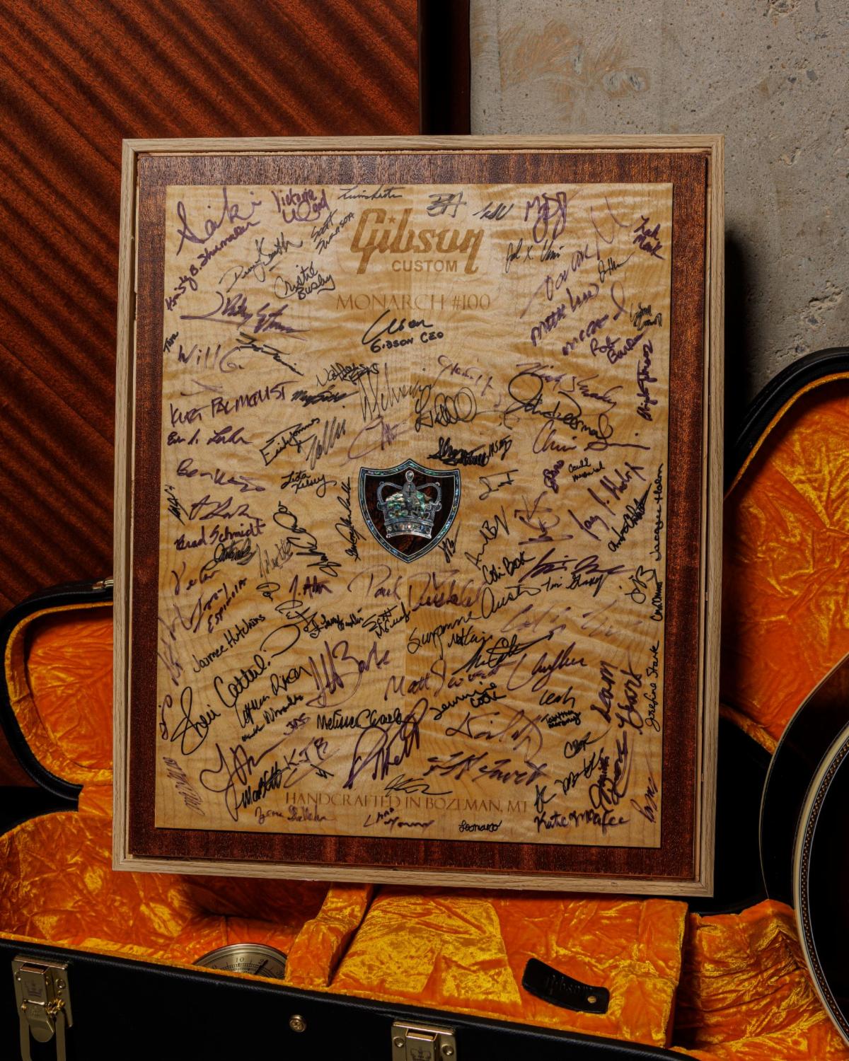 | A close up of the wooden plaque hand signed by the Gibson artisans that created the Gibson Monarch SJ-200 #100. |