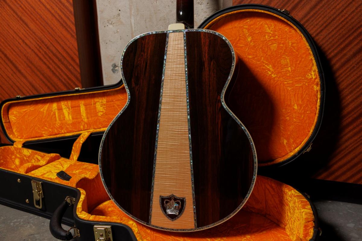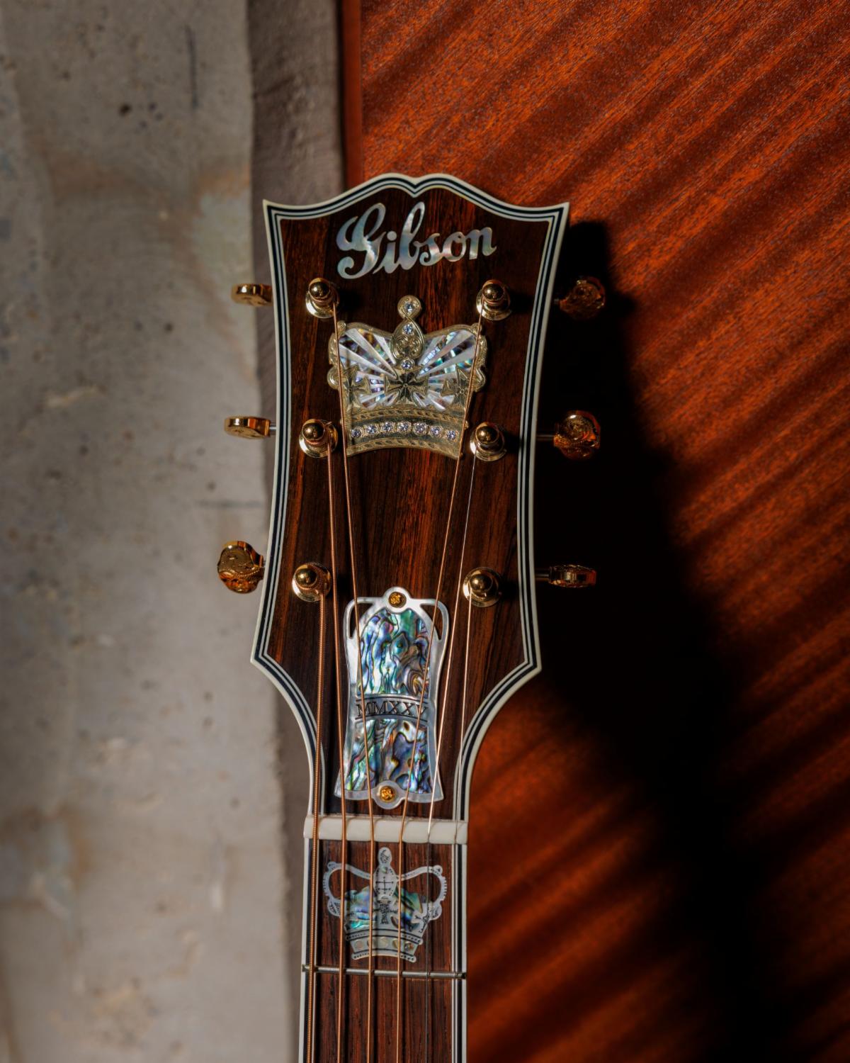 | Gibson Custom SJ-200 Monarch #100 headstock and fretboard features diamond, mother of pearl and abalone inlays. One of the most striking features of the SJ-200 Monarch 100 is its headstock centerpiece inlay. Crafted from 1.2 ounces of solid 18K gold, the hand-engraved crown is set with nine natural diamonds, each weighing 0.1 carat, and crowned with a 0.25-carat diamond at its peak. Shell inlays add further elegance to the center of the crown. The interior of the guitar is equally ornate, featuring laminated Brazilian rosewood and spruce stays along the ribs, a gold-embossed Brazilian rosewood label inside the soundhole, and a Brazilian rosewood veneer on the headblock, embellished with a mother of pearl and abalone crown inlay. |