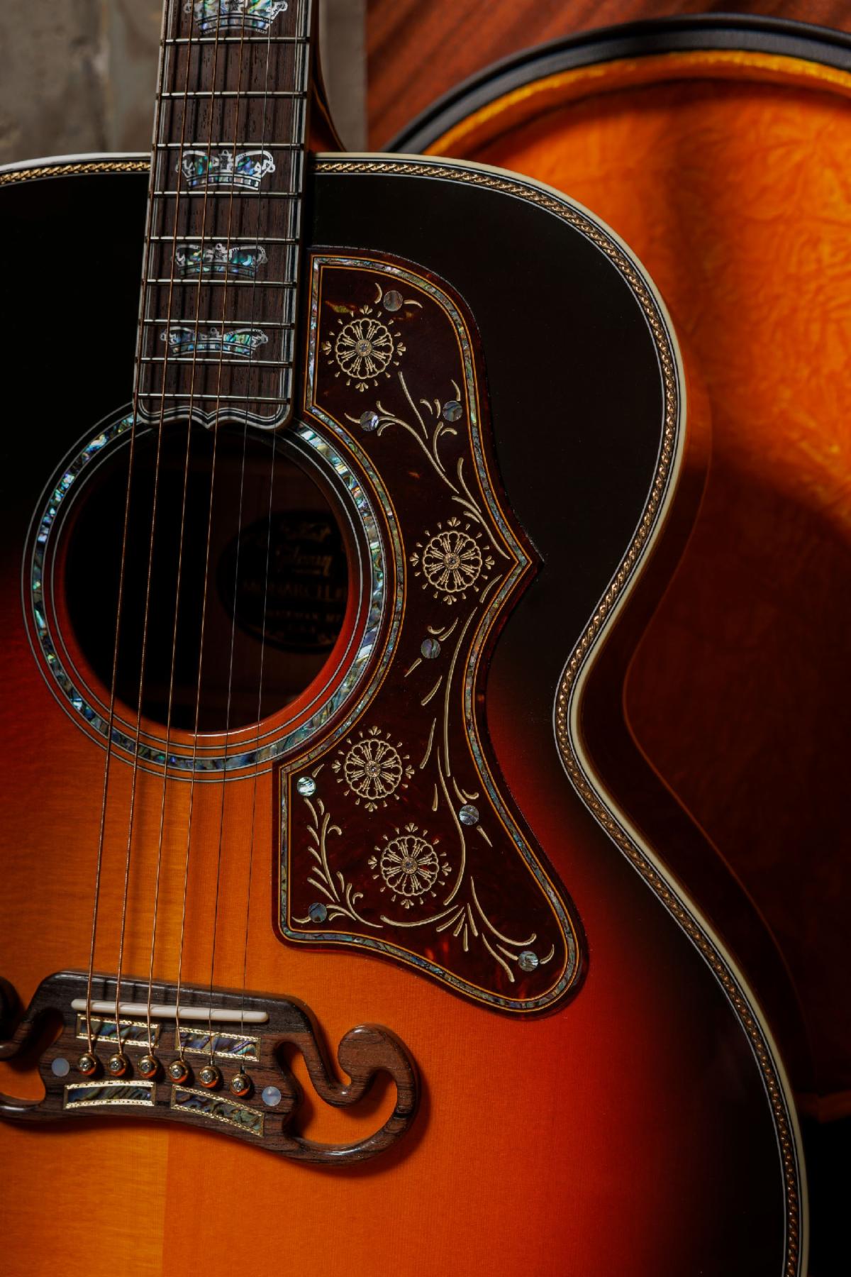 | Gibson Custom SJ-200 Monarch #100 pickguard. The iconic SJ-200 pickguard is crafted from celluloid tortoise material, machine-engraved and accented with an abalone border and dot inlays. Four natural diamonds, each weighing 0.1 carat, are set into the pickguard within solid 18K gold bezels, adding a touch of brilliance. The guitar is fitted with engraved gold Waverly open-gear tuners, while the nut and saddle are made from bone. The bridge pins, plated in 18K gold over brass, also feature 0.1-carat natural diamond inlays. To protect this regal instrument, a custom-designed Gibson Custom Monarch 100 hardshell case is included—thoughtfully crafted by the master luthiers and artisans in Bozeman, Montana, to reflect the guitar’s one-of-a-kind status and ensure it remains safe and secure. |