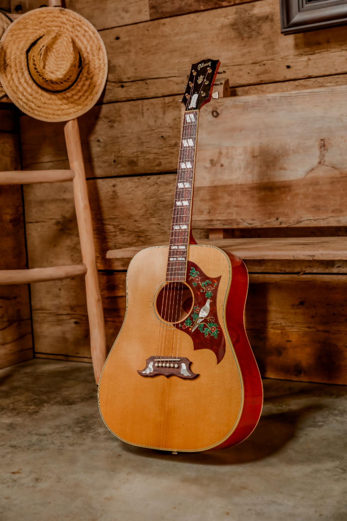 | 1963 Dove Light Aged All the tone, charm, and character of a vintage Dove—reborn First introduced in 1962, the Gibson Dove™ quickly became an icon of the square-shoulder acoustic family, following the Hummingbird™. With its bold voice and distinctive look, the Dove has been favored by legends like Elvis, Tom Petty, and Alex Lifeson. Now, Gibson Custom proudly presents the 1963 Dove Light Aged—a meticulous recreation of the early Dove models, crafted to deliver vintage tone and feel in a brand-new instrument. Featuring a thermally aged Sitka spruce top with traditional scalloped X-bracing and beautifully flamed maple back and sides in a Cherry finish, this Dove sings with clarity and power. The mahogany neck has a comfortable Round profile, paired with an Indian rosewood fretboard adorned with mother-of-pearl parallelogram inlays. A longer 25.5” scale length and maple body give it a bright, full voice that stands apart from the Hummingbird. Details like the rosewood Dove bridge with inlaid doves, engraved pickguard, and Kluson® Waffleback tuners complete the vintage aesthetic. Lightly aged by the Murphy Lab, it offers the look and feel of a well-loved original and comes housed in a vintage-style black hardshell case for the full Gibson Custom experience. |