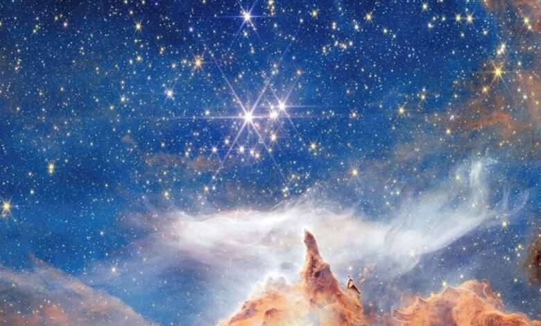 This is a sparkling scene of star birth captured by NASA’s James Webb Space Telescope. What appears to be a craggy, starlit mountaintop kissed by wispy clouds is actually a cosmic dust-scape being eaten away by the blistering winds and radiation of nearby, massive, infant stars.