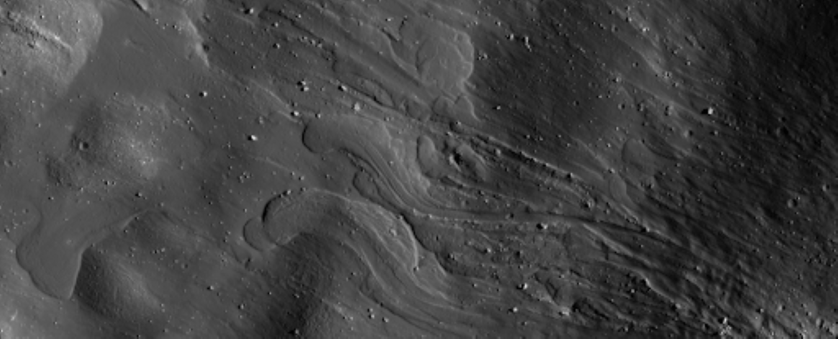 When asteroids hit the Moon, the impacts carve out craters and with enough energy and pressure, melt parts of the rocky surface. Often, the white hot, gooey melt (it’s like lava, except that it doesn’t erupt from underground) sloshes around the new crater and surrounding regions. The molten rock cools and hardens into vast rock features called impact melt flow deposits. These flow deposits are sculpture-like abstract art with beautiful lines and textures.