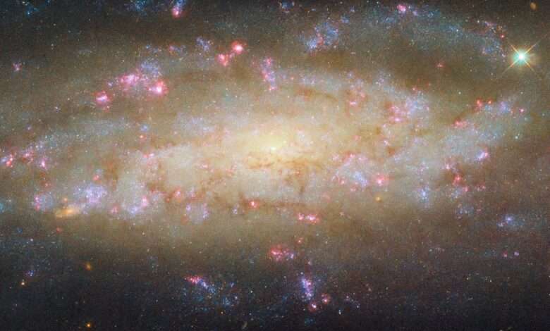 This Hubble image reveals fine detail in the galaxy’s patchy spiral arms, followed by clumps of dark, obscuring dust. Blossoms of glowing pink are rich reservoirs of gas where new stars are forming, illuminating the clouds around them and causing the gas to emit this tell-tale red light. The Hubble observing program that collected this data focused on the galaxy’s stellar activity, tracking new stars, clouds of hydrogen, and star clusters to learn how the galaxy evolved through time.
