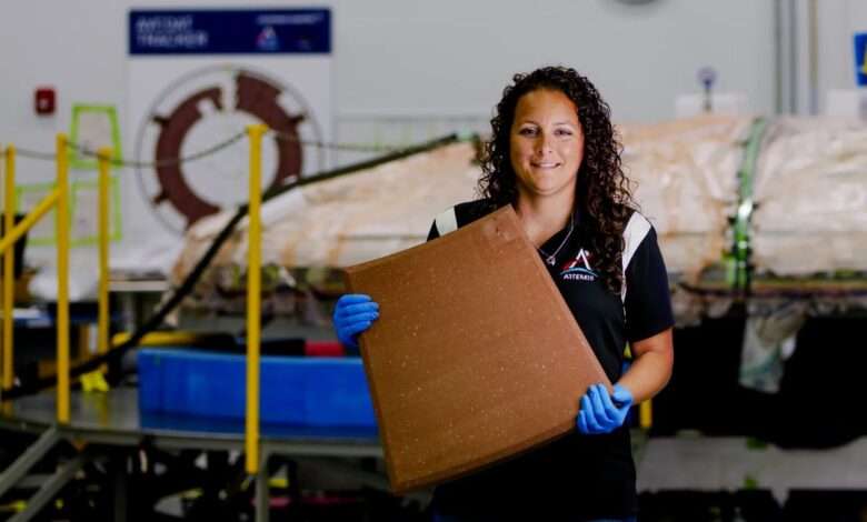 Diamond St. John, engineer on the Orion Program with Lockheed Martin, holds one of the heat shield tiles that will protect astronauts as they return to Earth after exploring the lunar surface on the Artemis III mission.