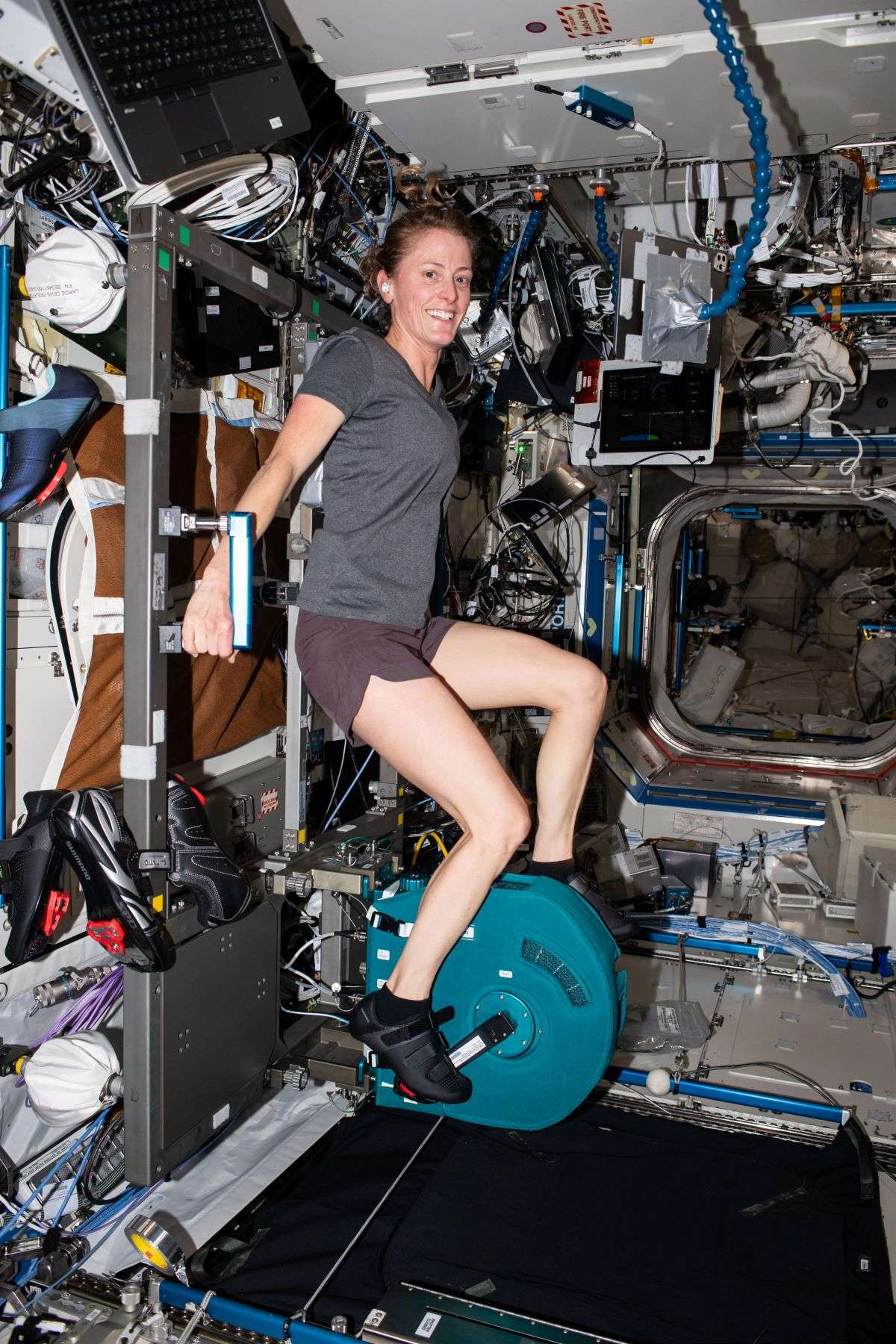 NASA astronaut Loral O’Hara pedals on the Cycle Ergometer Vibration Isolation System (CEVIS) inside the International Space Station’s Destiny laboratory module.