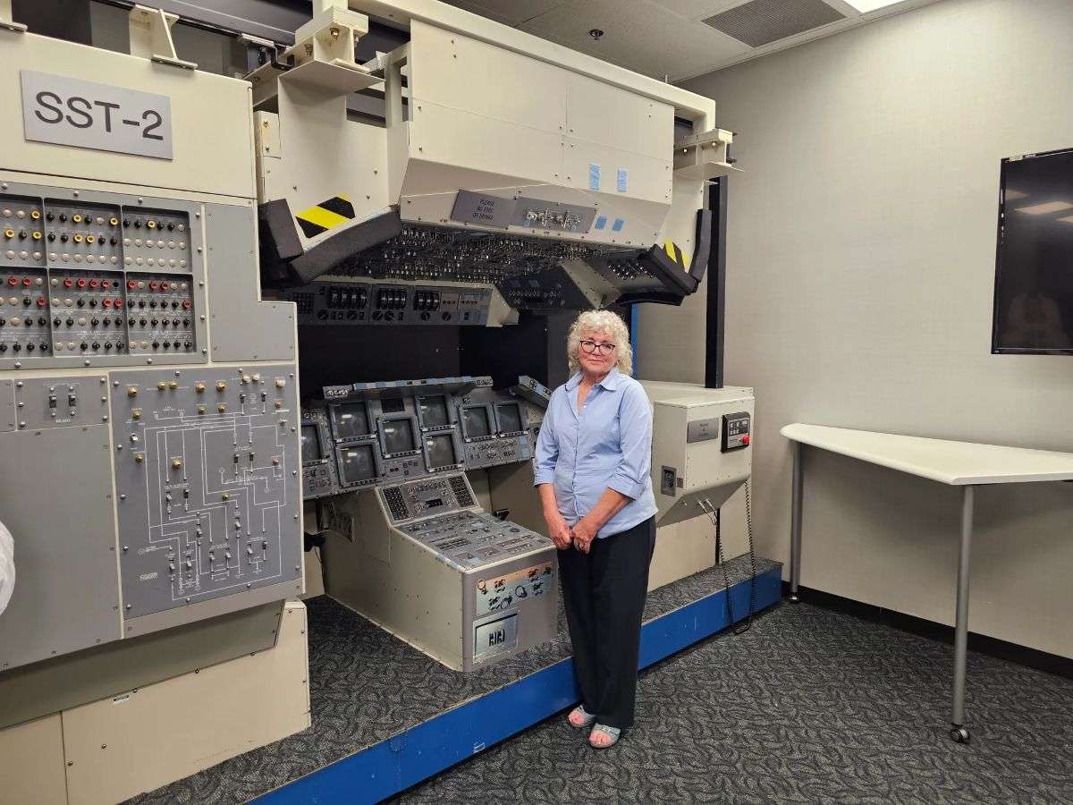 Mechele Elliott stands in front of a space shuttle cockpit mockup in the lobby of the Mission Control Center at NASA’s Johnson Space Center in Houston. Image courtesy of Mechele Elliott
