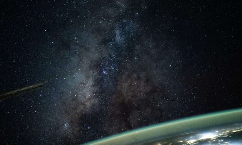 The Milky Way appears above Earth’s bright atmospheric glow in this Aug. 23, 2025, photograph from the International Space Station as it soared 261 miles above southern Iran at approximately 12:54 a.m. local time. The camera was configured for low light and long duration settings.