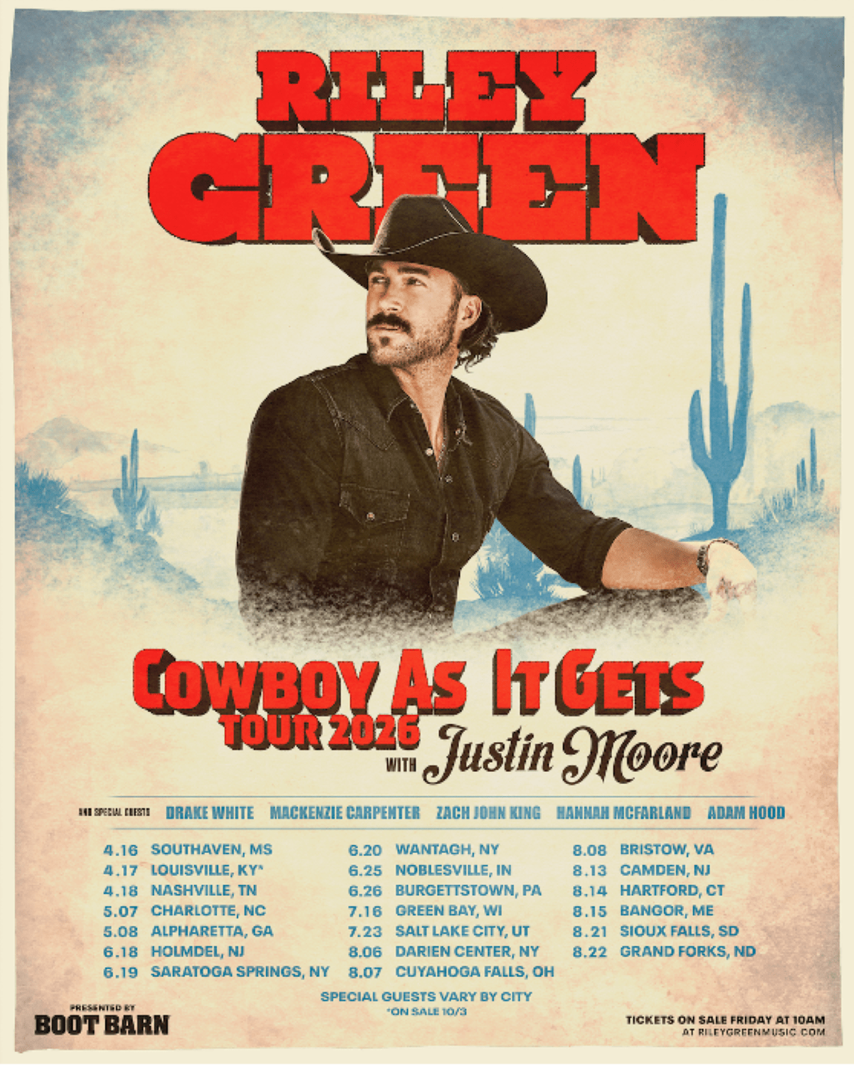 Today, multi-PLATINUM, ACM and CMA Award-winning singer-songwriter Riley Green announces his 2026 headlining Cowboy As It Gets Tour.