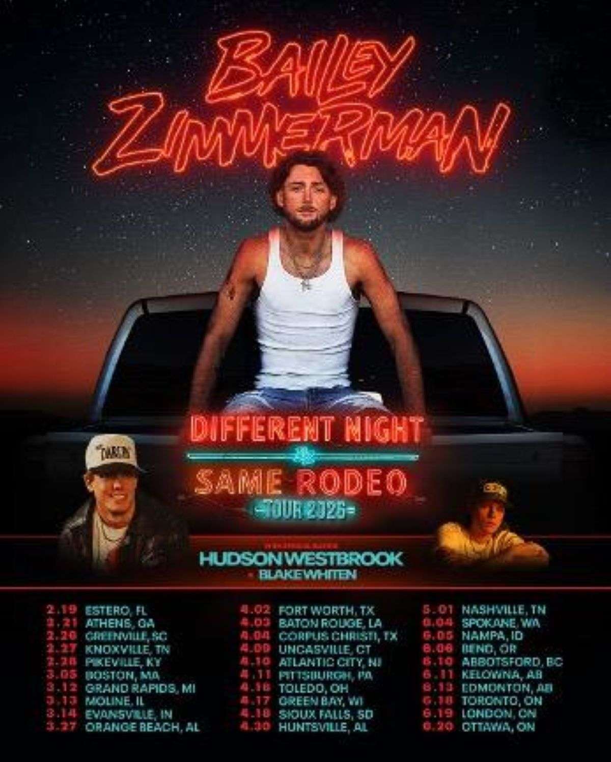 The announcement comes on the heels of Zimmerman’s recently released sophomore album Different Night Same Rodeo via Atlantic Records/Warner Music Nashville – listen HERE. The album includes country radio’s #1 hit superstar collaboration “Backup Plan” featuring Luke Combs as well as other hits such as “Lost” featuring The Kid LAROI, “Holy Smokes,” “Holding On” and more. Opening up like never before, Bailey delivers his rafter-shaking rock-powered country anthems while also elevating his artistry and sharpening his songcraft on the new body of work. Emphasizing the emotional rodeo of everyday life, the 18-track collection marks a bold step forward for Zimmerman.