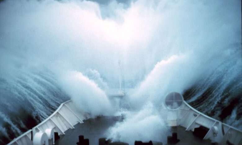 Large, warm currents like the Gulf Stream can have relatively sharp boundaries since they are generally higher than their surroundings. Water expands as it warms, so warm seawater is taller than cooler water. If waves interact with these currents in a certain way, seas can become extremely rough, presenting a hazard to even the largest ships.
