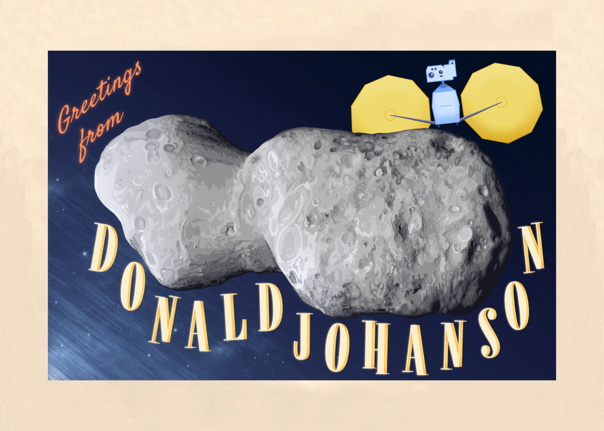 Postcard commemorating NASA’s Lucy spacecraft April 20, 2025, encounter with the asteroid Donaldjohanson.