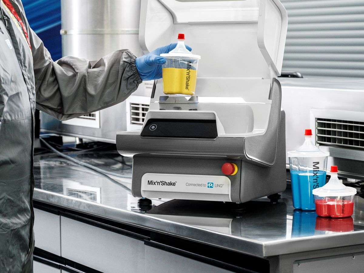 The PPG Mix‘n’Shake technology features pre-programmed settings for primers, basecoats and clearcoats. Users insert the notched cup, select a setting and let the device handle the mixing. Once complete, the cup attaches directly to a spray gun, reducing handling and streamlining workflow.