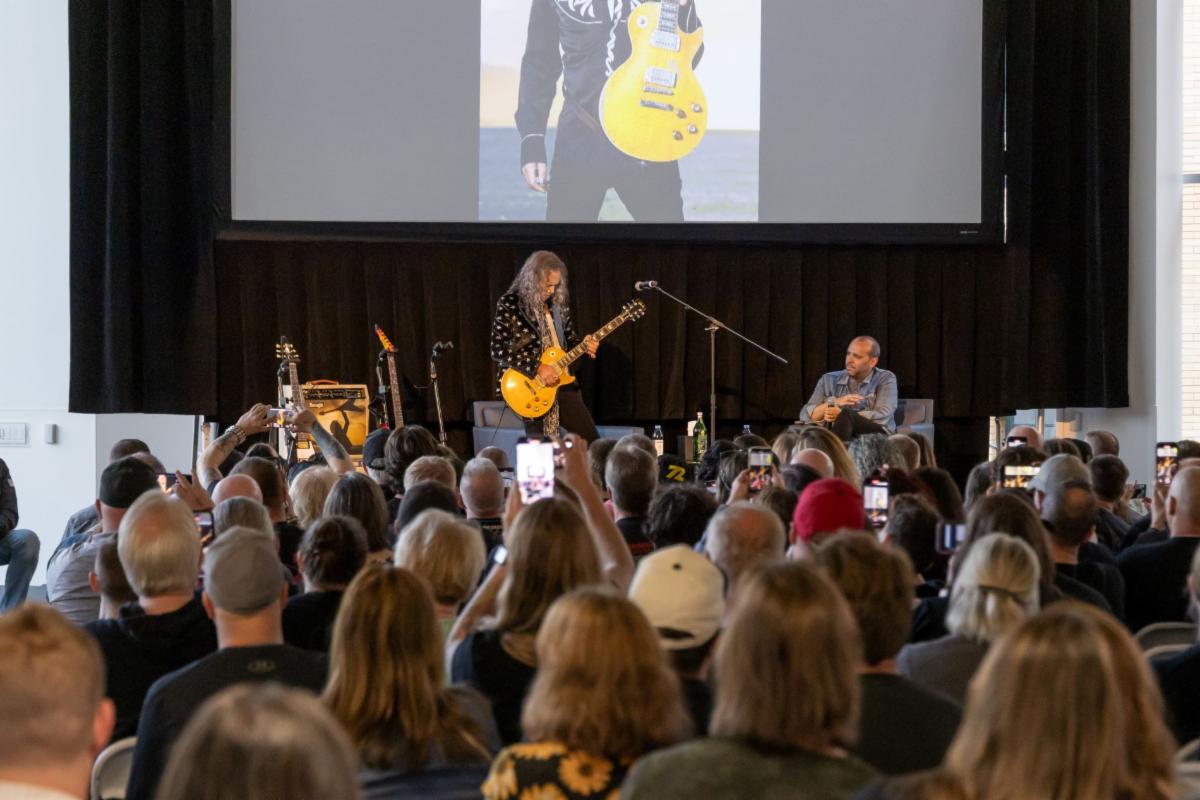 | Above: Kirk Hammett performs at the “KIRK HAMMETT The Collection: Live” book tour at the Columbus Metropolitan Library in Columbus, OH. |