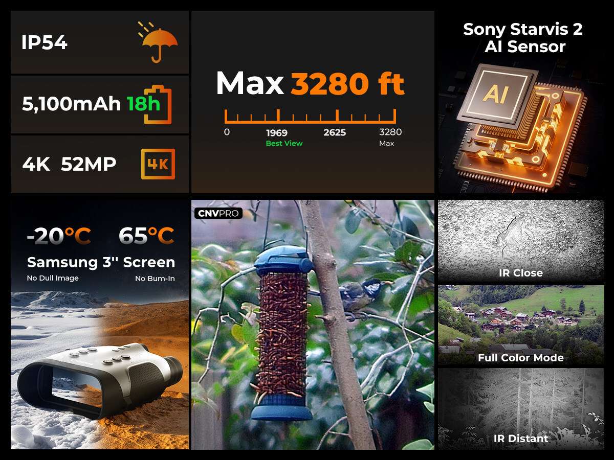In civil twilight conditions, the CIGMAN CNVPRO can capture vivid full-color images without infrared. A 5,100mAh battery ensures up to 18 hours of operation in non-IR mode. Designed for both photography and video, it produces high-fidelity stills and detailed 4K recordings suitable for professional and recreational use.