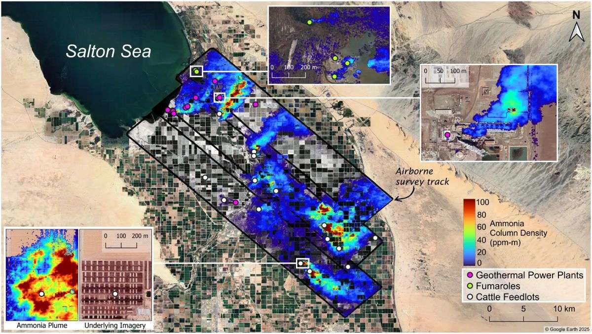 Published in Atmospheric Chemistry and Physics in October, the study focuses on a series of 2023 research flights that covered the Imperial Valley to the southeast of the Salton Sea in inland Southern California, as well as the Eastern Coachella Valley to its northwest. Prior satellite-based research has identified the Imperial Valley as a prolific source of gaseous ammonia. In the study, scientists employed an airborne sensor capable of resolving ammonia plumes with enough detail to track their origins: Aerospace Corporation’s Mako instrument is an imaging spectrometer that observes long-wave infrared light emitted by areas of Earth’s surface and atmosphere 6 feet (2 meters) across.