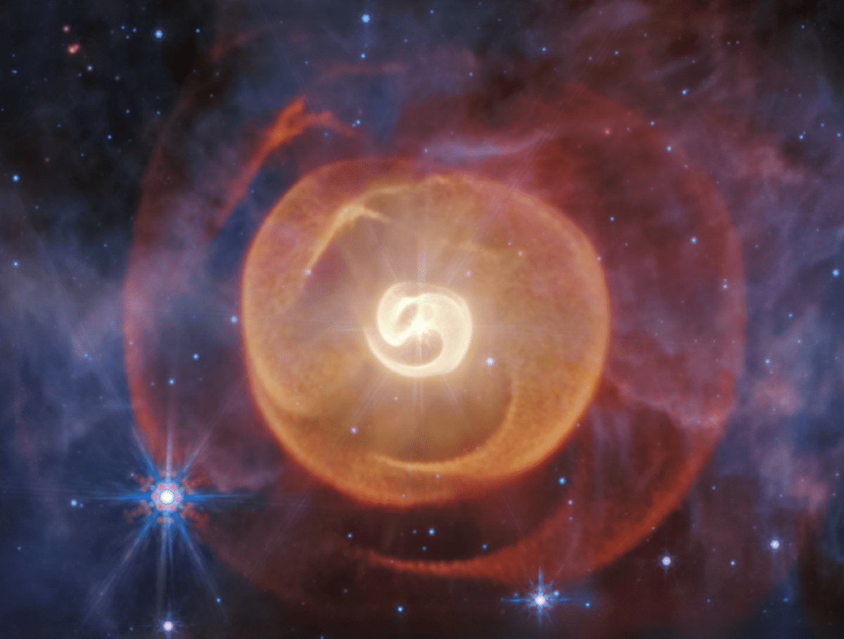 Webb’s mid-infrared image shows four coiled shells of dust around a pair of Wolf-Rayet stars known as Apep for the first time. Previous observations by other telescopes showed only one. Webb’s data also confirmed that there are three stars gravitationally bound to one another.