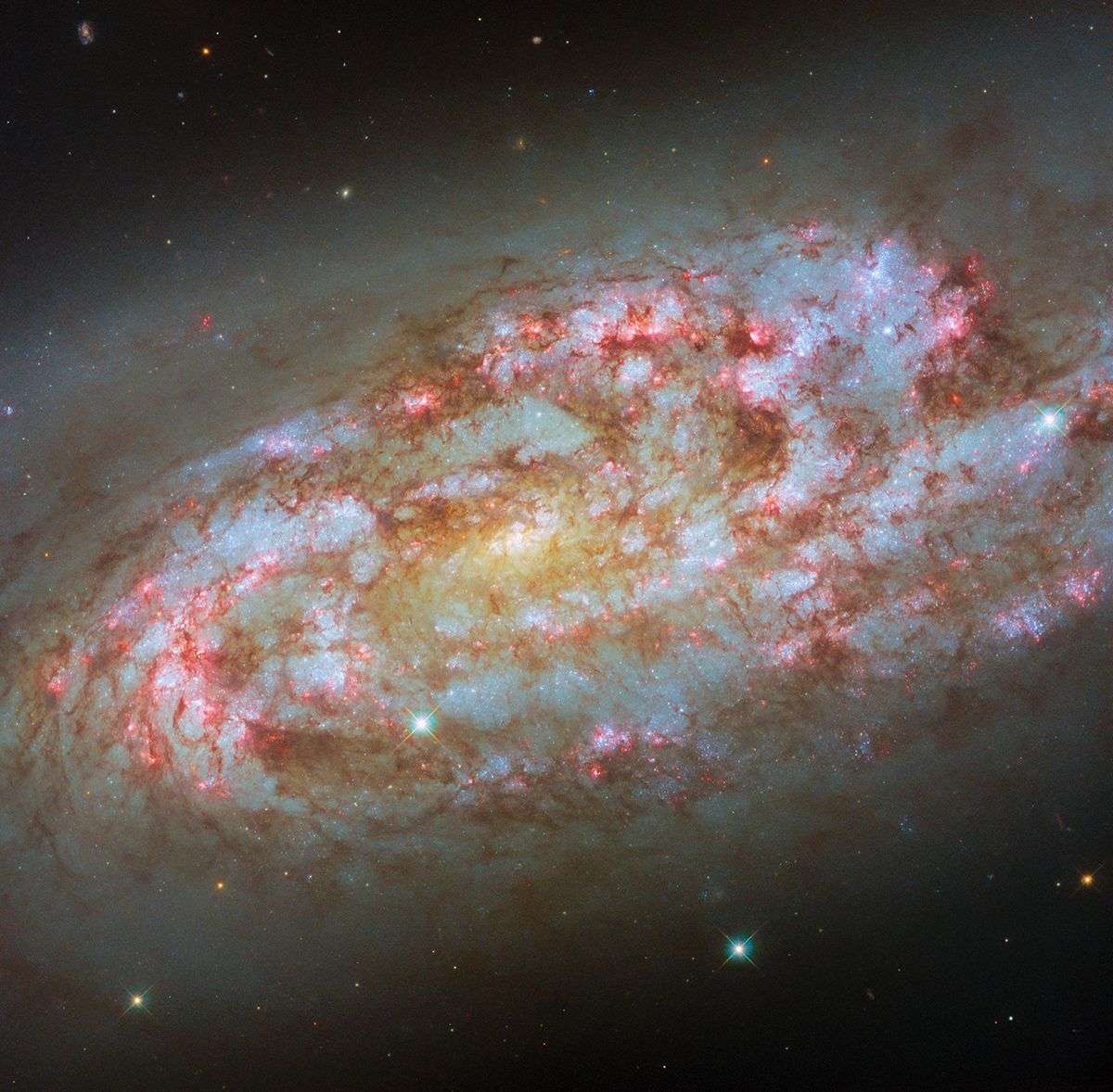 This NASA/ESA Hubble Space Telescope image features a stormy and highly active spiral galaxy named NGC 1792. Located over 50 million light-years from Earth in the constellation Columba (the Dove), the bright glow of the galaxy’s center is offset by the flocculent and sparkling spiral arms swirling around it.