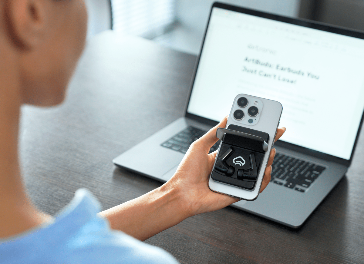 Komutr’s standout feature is its integrated MagSafe-compatible case that snaps directly to the back of your phone or to MagSafe-compatible accessories. Whether you’re commuting, working out, or traveling, Komutr stays attached – so you’re not digging through bags or pockets wondering where your earbuds went. The case is only about 0.47 inches thin, and each earbud weighs around 0.14 oz, making Komutr one of the slimmest and lightest MagSafe earbud solutions available today. The case also doubles as a built-in kickstand, so you can snap, flip, and prop your phone up for video calls, movies, or flights.
