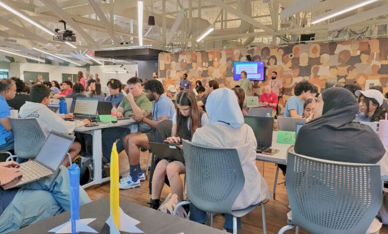 Participants work on their projects at the NASA Space Apps Challenge in Austin, Texas, at one of more than 50 local events held in the United States.
