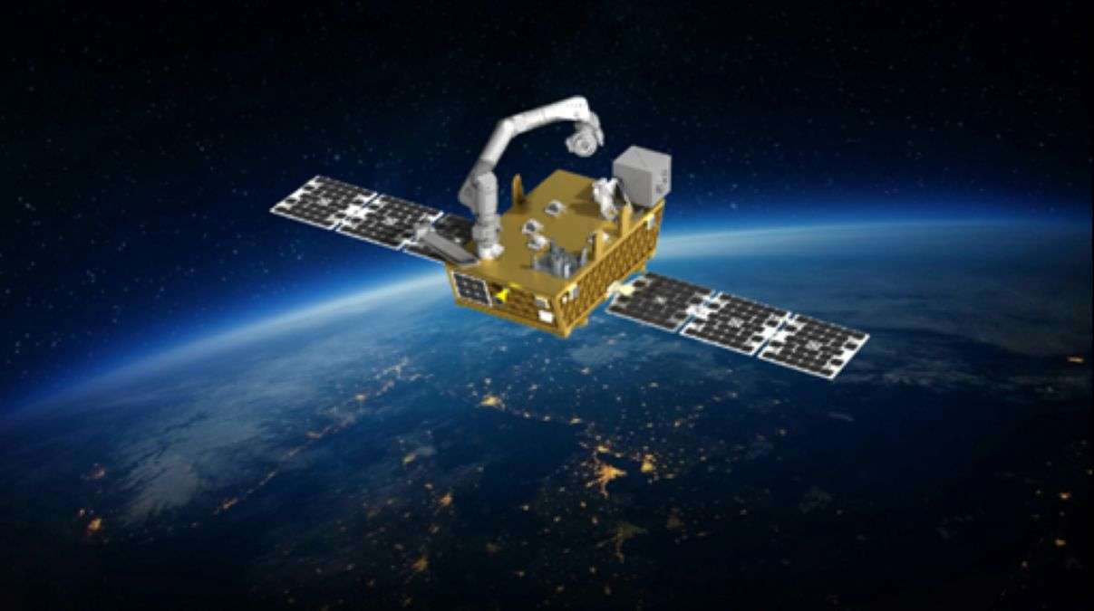 Artist concept of the FFR Mission’s robotic system payload atop the Astro Digital spacecraft. The robotic arm, provided by Motiv Space Systems, will perform robotic demonstrations in orbit.