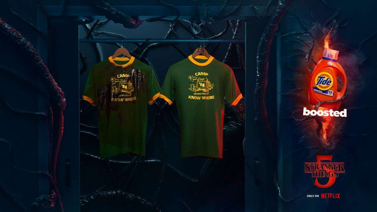 Tide®, America’s #1 trusted laundry detergent brand, is proud to announce its partnership with Netflix’s Stranger Things for the show’s highly anticipated fifth and final season. This collaboration celebrates the show’s most memorable looks – like Eleven’s pink dress and Dustin’s ‘Camp Know Where’ tee – with stain-induced scenes inspired by the show, like Demogorgon-goo and pizza grease, putting Tide’s most advanced formula yet to the test. The partnership is brought to life through a nostalgic TV commercial starring Stranger Things actress Cara Buono.