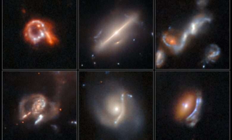 Six previously undiscovered, weird, and fascinating astrophysical objects are displayed in this new image from NASA’s Hubble Space Telescope. They include three lenses with arcs distorted by gravity, one galactic merger, one ring galaxy, and one galaxy that defied classification.
