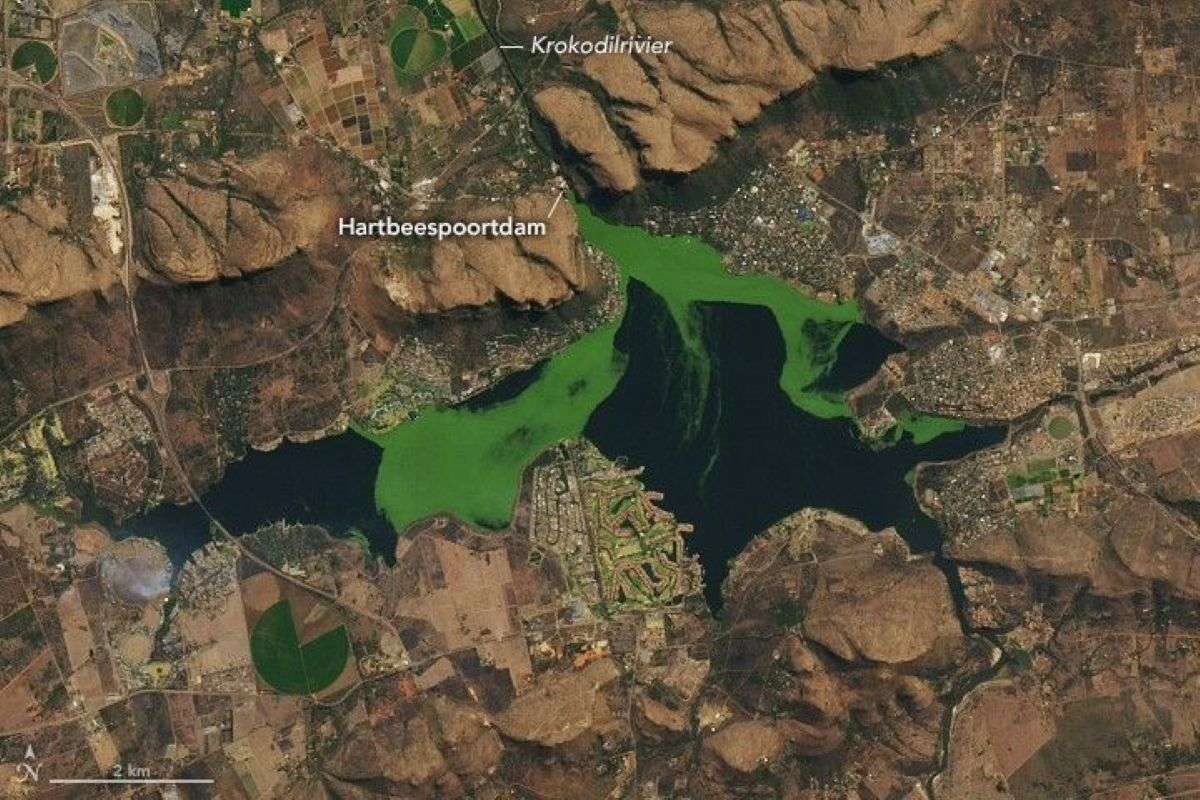 On clear days in Hartbeespoort, South Africa, satellite images often reveal a reservoir with shades of deep blue interrupted by drifting patches of vivid green. These shifting features indicate algae blooms, which can affect water quality, ecosystems, and nearby human communities.