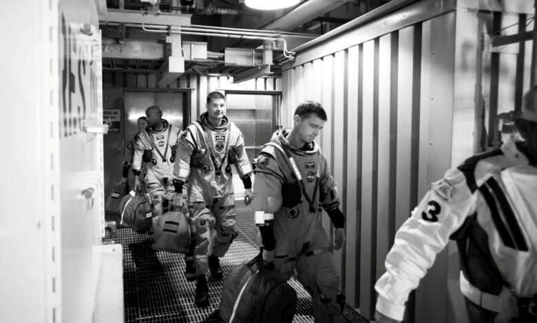 Artemis II crewmembers (left to right) NASA astronauts Christina Koch, mission specialist; and Victor Glover, pilot; CSA (Canadian Space Agency) astronaut Jeremy Hansen, mission specialist; and NASA astronaut Reid Wiseman, commander are led by Bill Owens of the Closeout Crew from the elevator at the 275-foot level of the mobile launcher to the crew access arm as they prepare to board their Orion spacecraft atop NASA’s Space Launch System rocket during the Artemis II countdown demonstration test, Saturday, Dec. 20, 2025, inside the Vehicle Assembly Building at NASA’s Kennedy Space Center in Florida. For this operation, the Artemis II crew and launch teams are simulating the launch day timeline including suit-up, walkout, and spacecraft ingress and egress.