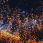 In this image, the four beaming stars near the bottom of the image and one in the top right corner are also Orion variable stars. The rest of the cloudscape is studded with other young stellar objects.