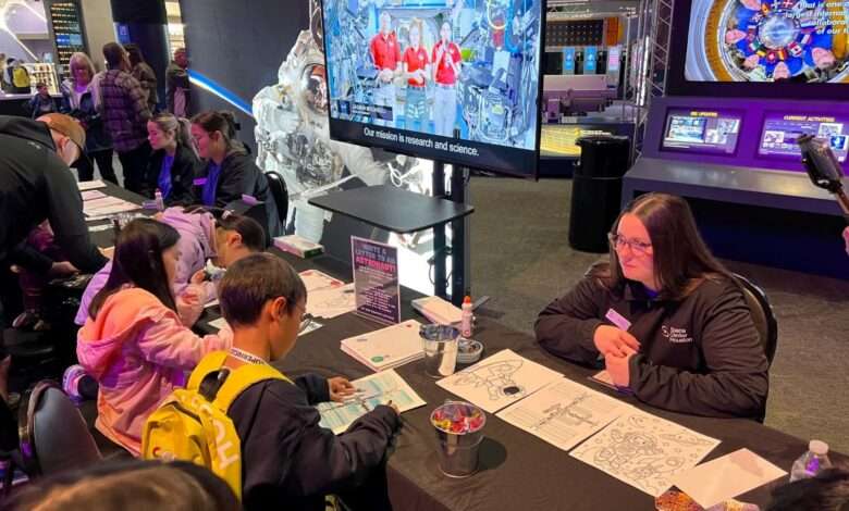 Space fans received a “Go for Launch” card and a stamp after completing activities at three NASA stations to earn their choice of prize, either a space station activity book or a 2026 space station calendar. Volunteers also handed out pins and stickers at tables once guests completed the challenge at each station.