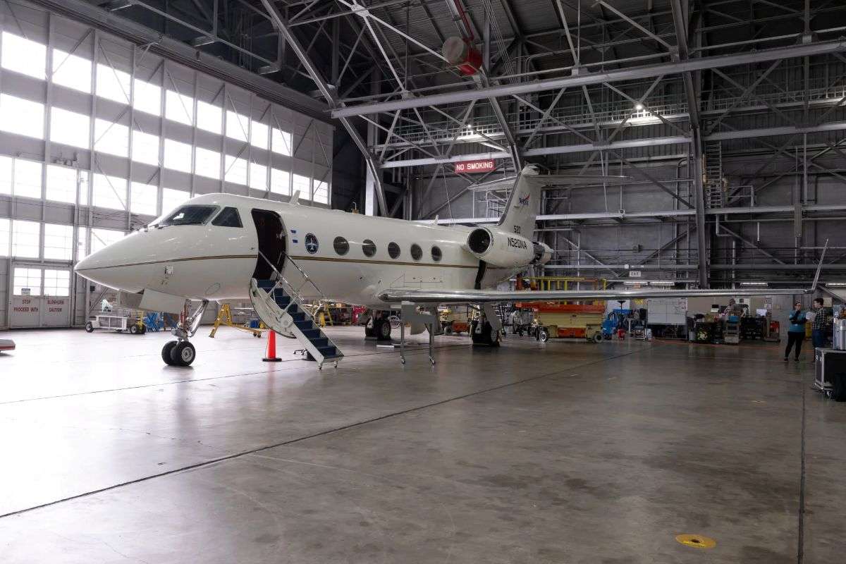 NASA’s G-III aircraft in the hangar at NASA’s Langley Research Center as science and flight crews install remote sensing instruments inside and onto the body of the plane.