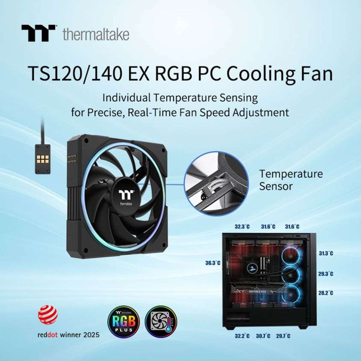 Thermaltake, a leading PC DIY brand for premium hardware solutions, proudly announces the launch of the TS120 EX RGB and TS140 EX RGB cooling fans, available in both black and white editions. Marking a breakthrough in fan technology, the TS EX RGB is Thermaltake’s first fan series equipped with a built-in temperature sensor, enabling real-time, independent cooling adjustments. Combined with MagForce 2.0 magnetic quick connection and a unique Music Staff Lighting Effect, the TS EX RGB fans deliver a perfect balance of performance, efficiency, and visual brilliance.