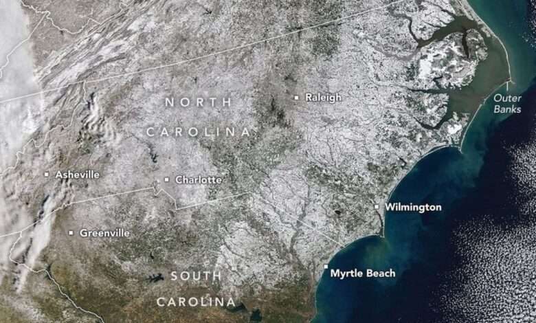 This image, acquired on February 2 with the MODIS (Moderate Resolution Imaging Spectroradiometer) on NASA’s Terra satellite, reveals a nearly continuous blanket of white stretching from mountain cities in the west to beachfront towns in the east. According to the North Carolina State Climate Office, measurable snow fell in all 100 counties for the first time in more than a decade.