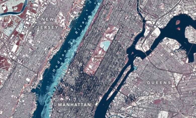 Much of the ice in the image likely floated there from farther upriver, where tidal currents are weaker and salinity is lower. These conditions allow water to freeze sooner and at higher temperatures than the faster-flowing, brackish water near the river’s mouth, shown here. A complete freeze of the Hudson around Manhattan is unlikely, experts say, although it did occur back in 1888. Still, the ice buildup was substantial enough for NYC Ferry to suspend services for several days.