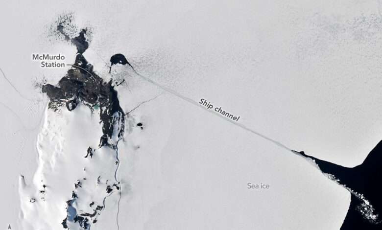‘Tis the season for long and ruler-straight cracks in McMurdo Sound’s sea ice. Though natural breaks in sea ice are called leads, the better term for the human-made fracture seen in these satellite images is a ship channel.