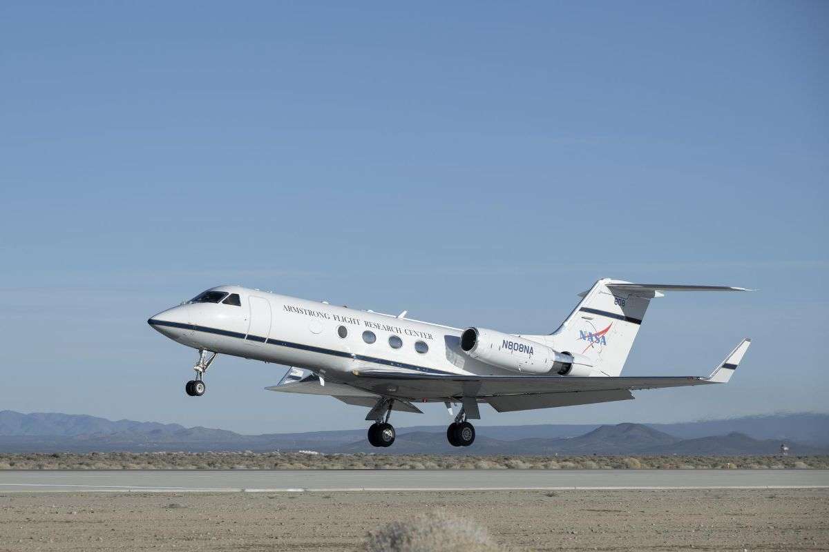 A NASA Gulfstream G-III aircraft lifts off from NASA’s Armstrong Flight Research Center in Edwards, California, on Tuesday, Jan. 20, 2026. Modifications were made to the aircraft to enable it to join three others flying at different altitudes to capture a complete view of the Orion spacecraft’s heat shield during Artemis II reentry. This effort is part of NASA’s Scientifically Calibrated In-Flight Imagery project.