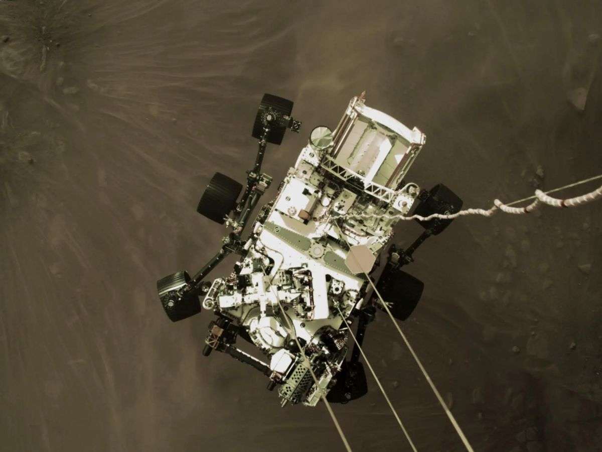 NASA’s Perseverance Rover approaches Mars in this Feb. 18, 2020, top-down still image captured by a camera on the rover’s descent stage.