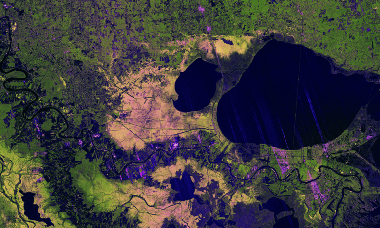 The colors in the image represent varying types of cover, which tend to reflect microwaves from the radar differently. Portions of New Orleans appear green, a sign that the radar’s signals may be scattering from buildings that are oriented at different angles relative to the satellite’s orbit. Parts of the city appear magenta where streets that run parallel to the satellite’s flight track cause the signals to bounce strongly and brightly off buildings and back to the instrument.