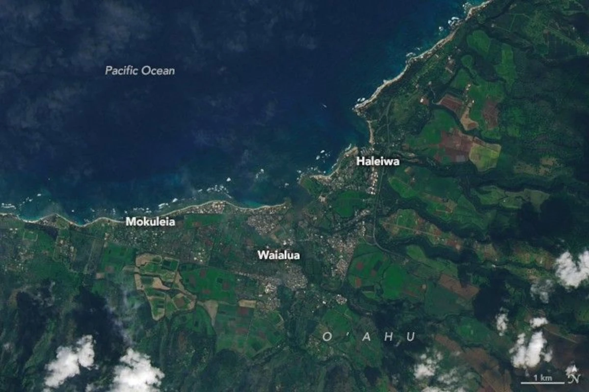 The satellite image on the right shows swamped neighborhoods and farmland between Mokuleia and Waialua on the island of O’ahu on March 14, 2026, after the first and more destructive storm system hit the island. Plumes of suspended sediment have discolored waters in and around Kaiaka Bay. Hawaii’s volcanic Hilo soils are known for being red due to the high levels of iron and aluminum oxide that accumulate as they weather. For comparison, the image on the left shows the same area on January 25, 2026, before the deluge.