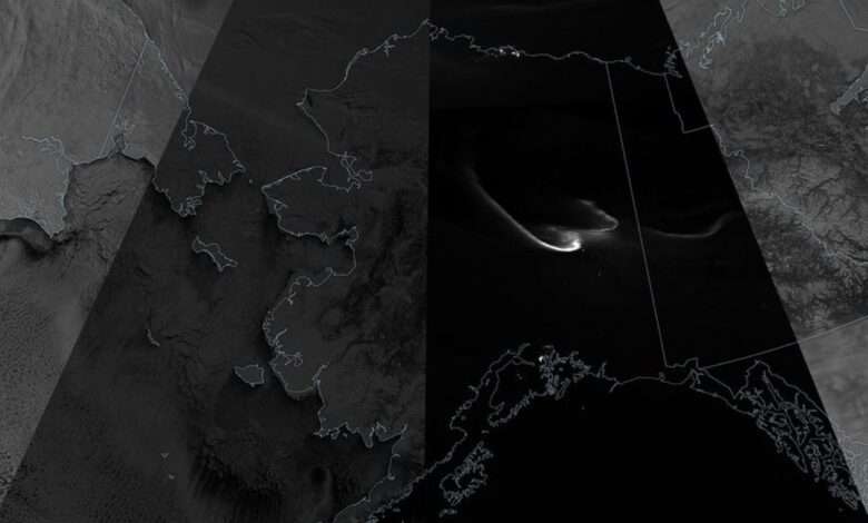Meanwhile, satellites observed the effect of the darkened Moon on Earth’s surface. Changes in the amount of moonlight reflected back to Earth as the eclipse progressed appear in this composite image, composed of nighttime observations made by the VIIRS (Visible Infrared Imaging Radiometer Suite) on the NOAA-21 satellite. The satellite collected these images of the Arctic about every 100 minutes, with earlier swaths toward the right and later swaths to the left.