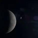 During an Earthset, the planet appears to sink below the lunar horizon. In this scene, a partially lit crescent Earth drops behind the Moon as seen by crew on the Orion spacecraft. The Earth’s sunlit side shows white clouds and blue water over the Oceania region, while the dark areas are experiencing nighttime. The image also shows incredible detail of the Moon’s surface and its overlapping craters and basins.