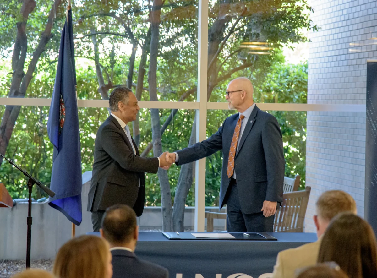 Mark Johnson, left, interim CEO of UNOS, signs his name as John Koelling, director of the Aeronautics Research Directorate at NASA’s Langley Research Center, looks on.