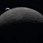 Seen during Artemis II’s lunar flyby on April 6, 2026, the Moon and Earth align in the same frame, each partially illuminated by the Sun. The Moon’s surface appears in sharp detail in the foreground, while Earth sits much farther away, smaller and softly lit in the background. A faint reflection in the spacecraft window is also visible, subtly overlaying the scene. Though their phases differ, both are shaped by the same sunlight, revealing the geometry of the Sun–Earth–Moon system from deep space.