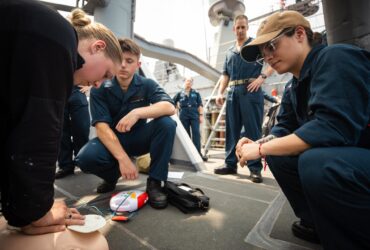 Beaver native performs chest compressions on a practice dummy aboard USS Bunker Hill