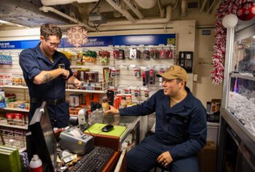 Pittsburgh native assists a customer in the ship’s store aboard USS Bunker Hill